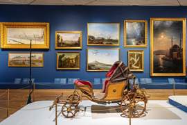 Одна из крупнейших в России коллекций придворных экипажей находится в «Царском Селе». Впервые в Москву для участия в выставке будут отправлены детские коляска и беговые сани, а также сани для взрослых, украшенные золочением и обитые парчой. Спец. раздел выставки посвящен русским военным мундирам, представленным в музейном собрании во всем многообразии. Наряду с мундирами императоров и вел. князей в коллекции хранятся детские мундиры царственных наследников и дамское мундирное платье императриц и вел. княжон. Одно из них – шефское мундирное платье Екатерины II по форме Лейб-гвардии Семеновского полка, выполненное из бархата с отделкой из золоченого галуна, вошло в состав выставки.