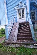 На той же лестнице, что как-то подметали (доказательство чему – брошенная тут же метла), ступени так щербаты, а кое-где и сломаны, что подняться вверх я не решился. Впрочем, оно и не разрешалось, «убитая» лестница перевязана была кое-как запретной ленточкой… Двери, окна, опоры – всё тут пришло в самое грустное состояние из всех возможных. Запустение и неухоженность.