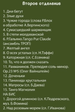 Из ВК: Елена Семенченко: Песни А.Вертинского обладают невероятной магией, их невозможно не узнать или с кем-то спутать. Изысканный жанр в котором творил Александр Николаевич, соединивший в одном лице композитора, певца и артиста, был поистине уникальным. В его песнях слышатся деликатные тона любви, нежности и ностальгии... В исполнении Олега Погудина они звучат с неповторимым шармом!!! Невероятно в исполнении О.Вайнштейна была исполнена прелюдия соль минор С.Рахманинова!!! Как хорошо, что Олег Погудин и его музыканты продолжают радовать нас удивительными страницами творчества Великого шансонье!. БРАВО!!!!