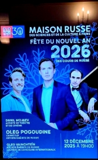 Олег Погудин: 12 января в Русском доме науки и культуры в Париже прошёл праздничный новогодний вечер, приуроченный к окончанию очередного семестра курсов русского языка. В рамках насыщенной программы вечера состоялось и наше полуторачасовое театрализованное литературно-музыкальное представление под названием «Мастера слова», героями которого стали Пушкин, Лермонтов, Вертинский, Цветаева и Ш.Азнавур. Приём был совершенно восторженным, в чём можно убедиться на этих фрагментах бисов. Учитывая, что в зале кроме соотечественников, были в основном слушатели курсов русского языка, аудитория больше чем наполовину состояла из франкофонов. Искусство во все времена и во всех обстоятельствах помогает людям видеть и ценить друг в друге главное и огромная радость с помощью искусства нести в этот мир разумное, доброе и вечное!