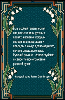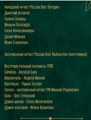 | ![]() Программа концерта I отделение: ![]() 1. «Снился мне сад» - муз. Б.Борисова, сл. Е. Дитерикс 2. «Под лаской плюшевого пледа» - муз. А.Петрова, сл. М.Цветаевой 3. «Взгляд твоих черных очей» - муз. Н.Зубова, сл. И.Железко 4. «Я ехала домой» -- муз и сл. М.Пуаре 5. «Две розы» - муз. С.Покрасса, сл. А.Д'Актиля 6. «Не лукавьте» - муз. и сл. А.Дюбука 7. «Ночные цветы» - муз. А.Шиловского, сл. Е.Варженевской ![]() 8. «Динь-динь-динь» - муз. и сл. Б.Юрьева 9. «Не уходи» - муз. и сл. Н.Зубова ![]() 10. «Вы просите песен»- муз. и сл. А.Макарова 11. «Как на речке»- рус. нар. песня ![]() П.И. Чайковский. "Русский танец" из балета "Лебединое озеро" 12. «За кулисами» - муз. и сл. А.Вертинского 13. «Не уходи» - муз. и сл. Н.Зубова 14. «Он говорил» - муз. Э.Дельпрейте, пер: М.Медведева, сл. А.Гуэрчиа ![]() 15. «Прощальный ужин» - муз. и сл. А.Вертинского 17. «Как цветок душистый» - муз. и сл. Н.Макарова II отделение: 18. «Снова слышу голос твой» - сл. А.Фета, муз. - Ф.Соколова ![]() 19. «Ой да, невечерняя» - цыганская нар. песня 20. «А напоследок я скажу»- сл. Б.Ахмадулиной, муз.А.Петрова ![]() 21. «Марфуша» - муз. и сл. М.Марьяновского продолжение следует Прикрепления: 1920170.png(2.2 Kb) · 3000558.jpg(113.9 Kb) · 3711130.jpg(97.5 Kb) · 3837559.jpg(17.3 Kb) · 4456710.jpg(5.9 Kb) · 5513462.jpg(5.8 Kb) · 8433859.jpg(131.0 Kb) · 8644520.jpg(19.1 Kb) · 8977922.jpg(19.2 Kb) · 9584015.jpg(21.3 Kb)