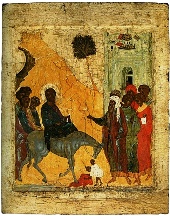 Рублев же создал икону, сосредоточенную не на бытовых деталях, а на богословии. Три Ангела - образ Предвечного Совета Лиц Святой Троицы, на котором решается участь человека. И чаша - образ св. Евхаристии. Кроме того, «Троица» Рублева - явление поразительной гармонии и красоты. Бог является здесь в красоте и гармонии. Красота - одно из имен Божиих. И в этом тоже есть глубокое богословие. Весьма вероятно, что Рублеву принадлежит часть росписей в Успенском соборе Владимира - фрески с изображением Страшного Суда. И в этих фресках мы тоже видим глубокое богословское осмысление, свойственное Рублеву.